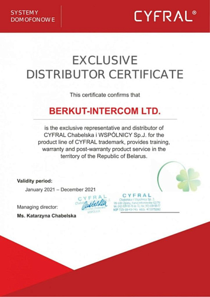 ООО "Беркут-ИНТЕРКОМ" - официальный дилер Cyfral в Беларуси