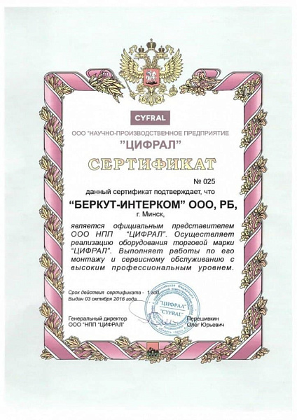 В Республике Беларусь официальным представителем бренда "Cyfral" является компания ООО "Беркут-ИНТЕРКОМ". Мы осуществляем реализацию оборудования, выполняем работы сервисному обслуживанию с высоким профессиональным уровнем.В офисе ООО "Беркут-ИНТЕРКОМ" и на нашем сайте вы всегда сможете получить подробную техническую консультацию по вопросам подбора и эксплуатации оборудования Цифрал.