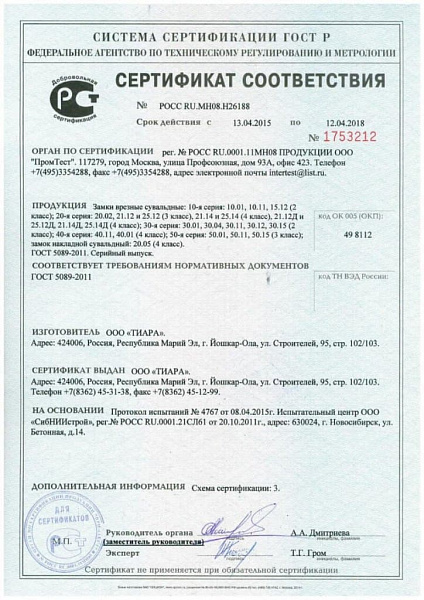 Все замки имеют сертификаты соответствия требованиям нормативных документов ГОСТ 5089-2011. Несмотря на отмену обязательной сертификации замочной продукции, "Гардиан" продолжает испытывать и тестировать замки в известных специализированных лабораториях и центрах. На основании их заключений каждому замку присваивается свой класс защиты.