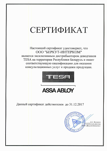 Приобрести дверные доводчики TESA в Минске сегодня достаточно просто. В январе 2013 года ООО "БЕРКУТ-ИНТЕРКОМ" подписало соглашение об эксклюзивном праве представлять дверные доводчики TESA на территории РБ.